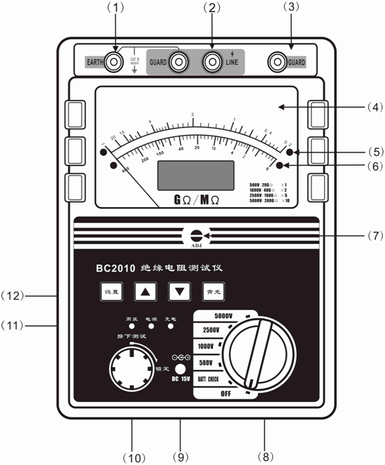 5000V/2GΩ~200 GΩ(刻度讀數(shù)×10)。